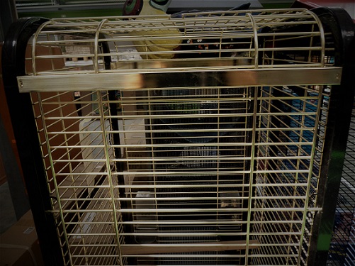 in den noch vorhandenen, leeren, goldfarbenen Käfig.